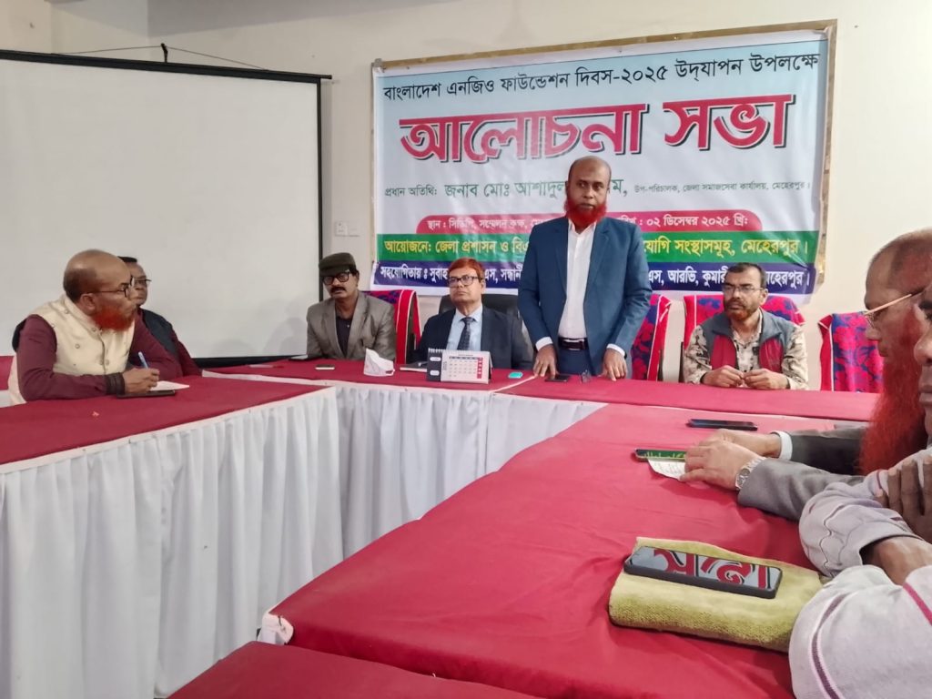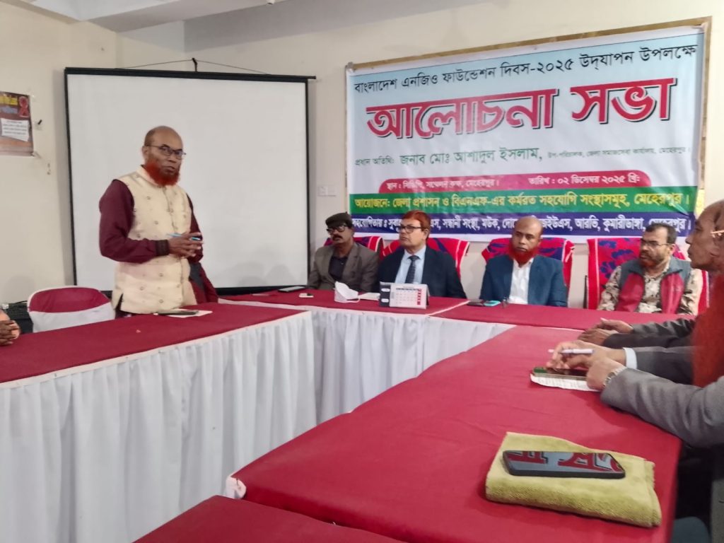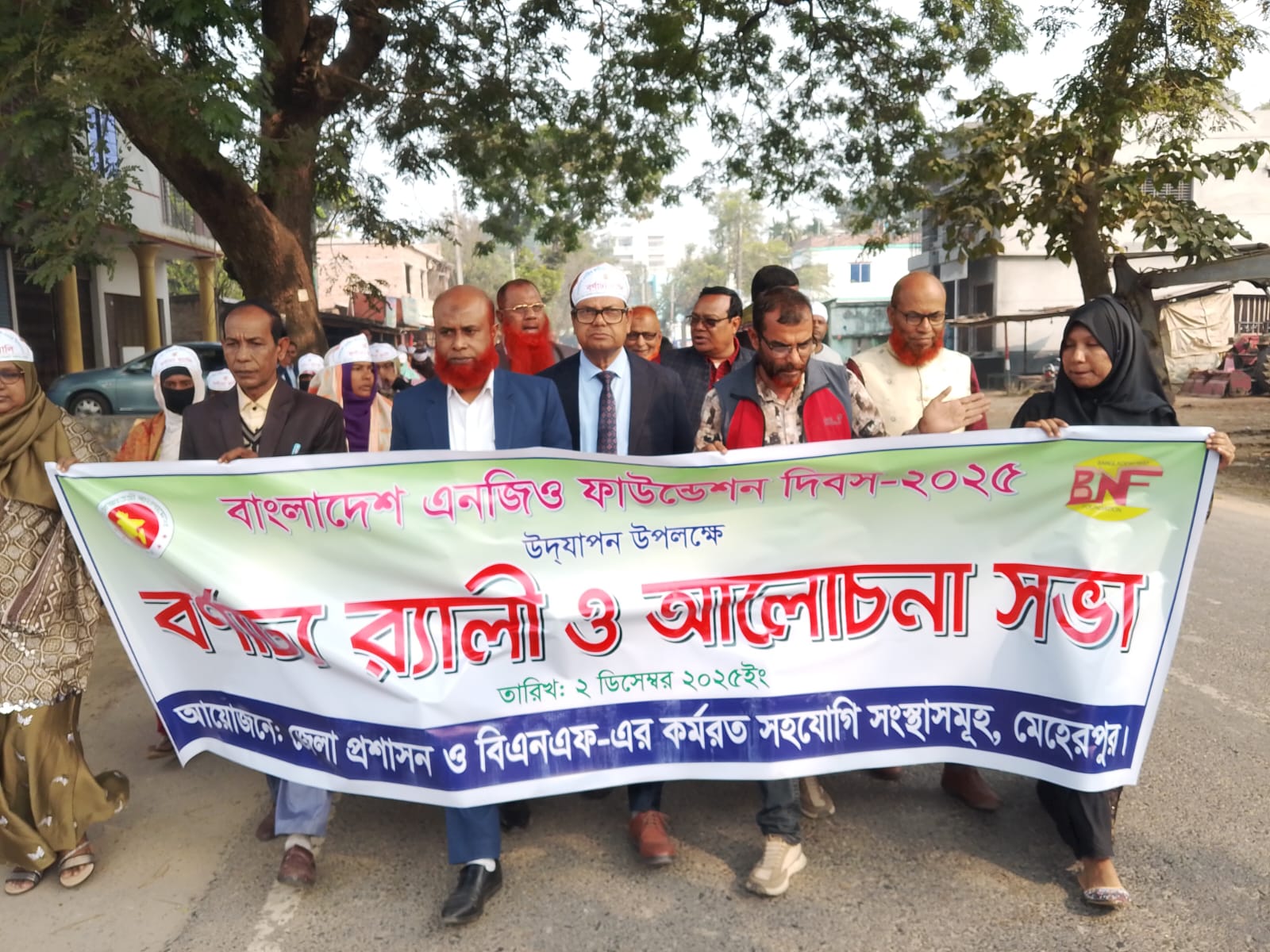 অদ্য-০২/১২/২০২৫ ইং তারিখে বাংলাদেশ এনজিও ফাউন্ডেশন দিবস-২০২৫ উদযাপন উপলক্ষে বর্নাঢ্য র্যালি ও আলোচনা সভার আয়োজন করা হয়। উক্ত সভায় প্রধান অতিথি হিসেবে উপস্থিত ছিলেন জনাব মোঃ আশাদুল ইসলাম (উপ-পরিচালক) জেলা সমাজসেবা কার্যলয় মেহেরপুর। আরও উপস্থিত ছিলেন পলাশীপাড়া সমাজ কল্যাণ সমিতি এর পরিচালক জনাব মোঃ কামরুল আলম ।